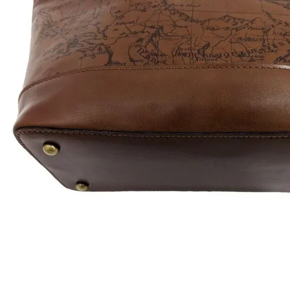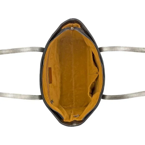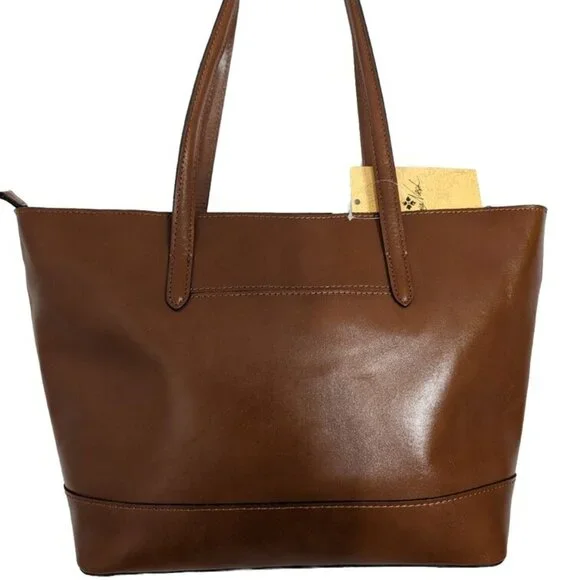 Patricia Nash Verzi Leather Tote Bag-New With TagsSize/Profile:Large toteWalls:Rich, genuine leather with burned edge finishTrim:Signature embossed grape leaf logoHandles:Dual rolled leather handlesConstruction:Heavy, hand-crafted stitching; flat bottom with metal feetHardware:, brasstoneClosure:Top zipperLining:Faux suede/velvety fabric liningExterior:1 slip pocketInterior:1 zip pocket; 2 slip pocketsSize & ContentMeasurements:Approx. 11.5"L x 4.75"W x 10.125"H with 10" handle dropWeight:Approx. 26.4 oz (unpackaged)Content:100% leather shellCare:Wipe with soft, damp cloth