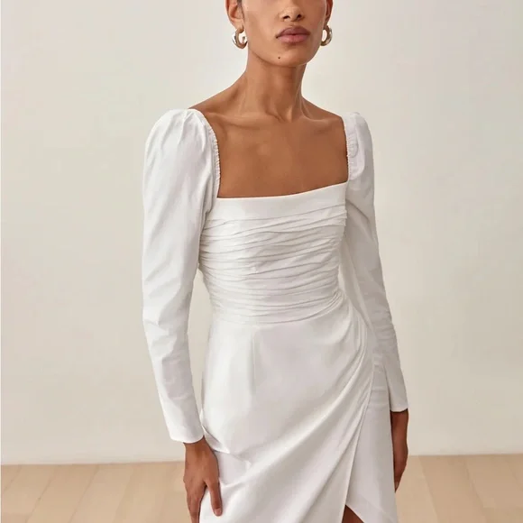 This stunning gown by Reformation features a sophisticated square neckline and elegant puff long sleeves. The ruched detailing and dramatic side slit add a touch of allure, making it perfect for bridal or cocktail occasions. Its clean, minimalist design in a white or cream hue ensures a timeless and chic appearance.Work once for engagement photo shoot with a slight scuff on back of elbow sleeve.