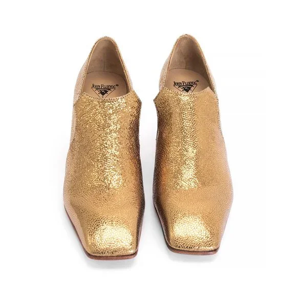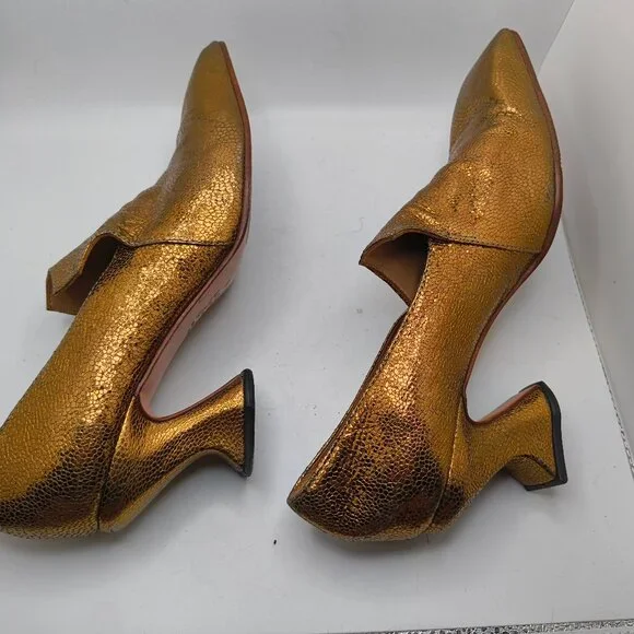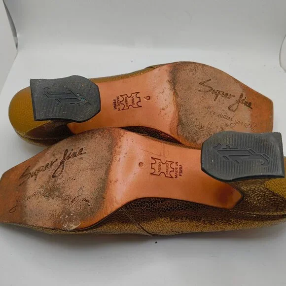 The description is from the Fluevog site (as it is written so well there!)The photos are also from there, as well as from me to show the worn marks on it.Size 9- very comfortable!Super FineCardinalSquare-toe loafer heelJohn doesn’t exactly answer prayers, but he’s always been up to granting the odd wish or two. A shoe that combines a Tudor-inspired square toe with the total sophistication of a Peruvian heel, The Super Fine Cardinal just might get you mistaken for a saint. Featuring smooth leathers and angular lines, these sharp shooters are rigid and regal in appearance but soft and supple in actual feel. Super Fine! Yes indeed you are.Made in PeruTextured metallic gold onlyLeather soles2.5" leather wrapped ABS heel with a thermoplastic heel liftReheelableThis style is in the Flueseum! Enjoy!