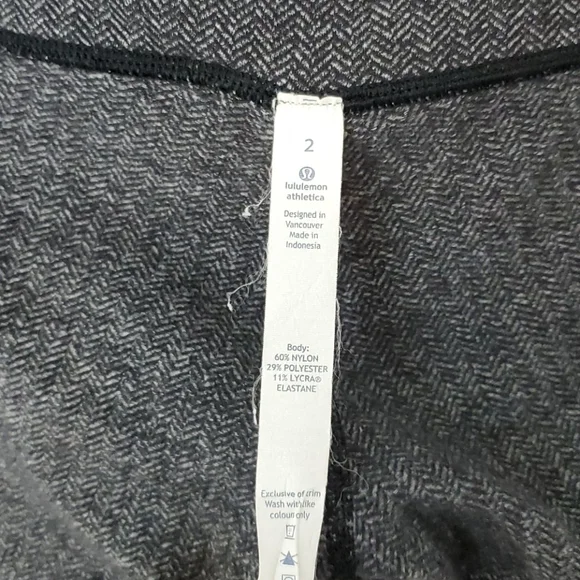 Lululemon Wunder Under Pants HerringboneColor: Herringbone/BlackSize: 2Fit: Tight** All measurements are taken flat lay style and are approximate**Rise: 6.4" approxBand: 3.5" approxInseam: 28.8" approxLeg opening: 3.4" approxMaterial: 60% Nylon 29% Polyester 11% Lycra SpandexDescription: Gusset design, pocket at waistband, herringbone designLaundered: Washed in 7th Generation & Oxiclean, hung to dryCondition: Fading from wash/wear, stitched up hole at right leg shin area along stitching WC163D0