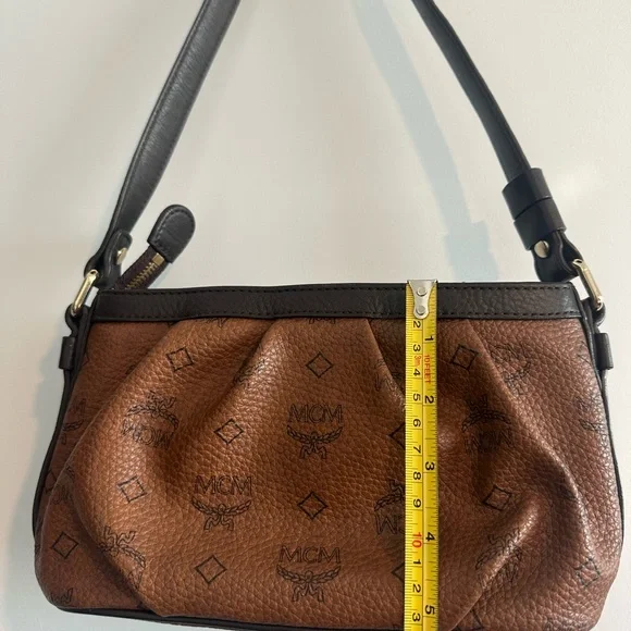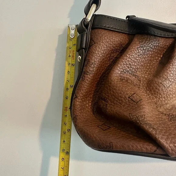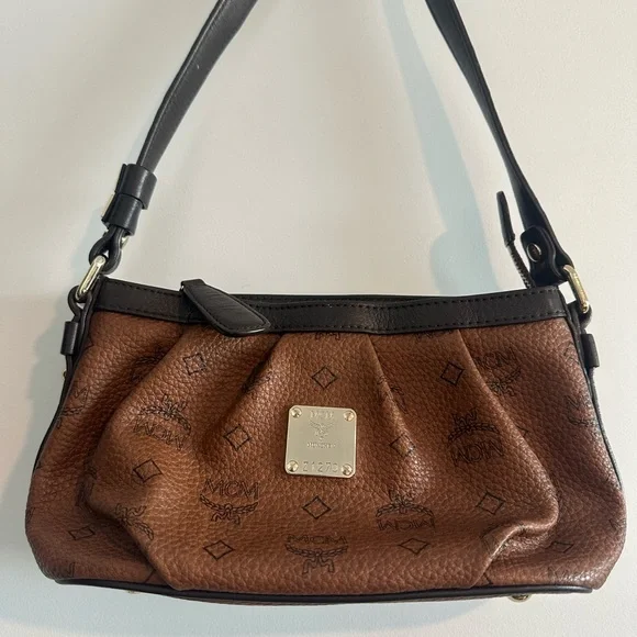 Authentic MCM crossbody shoulder bag, crafted in rich brown leather. The iconic MCM monogram pattern adds a touch of elegance, while the high-quality leather and detailed stitching ensure durability and style. used a few time still in goodcondition no smell very slight scratch or rubbing comes with dust bag , clearing out my purse collection