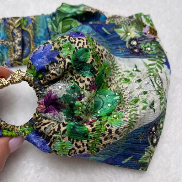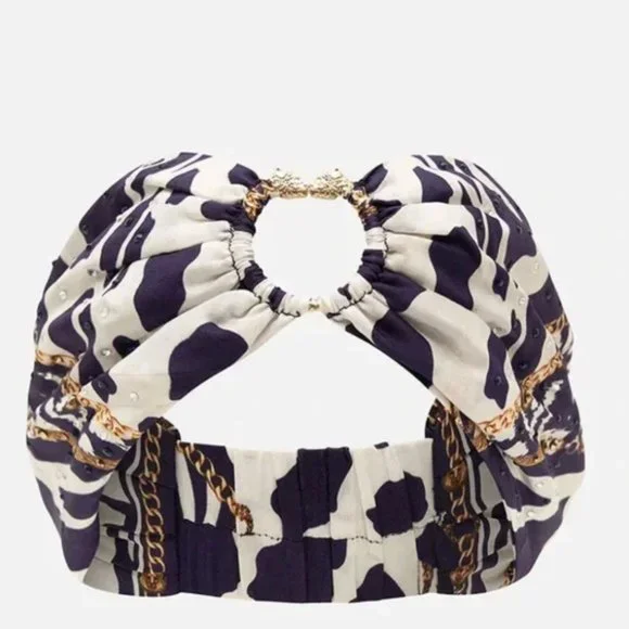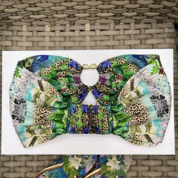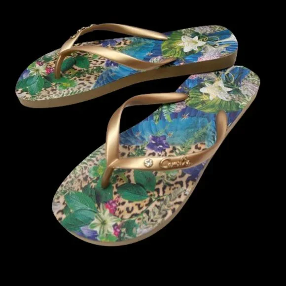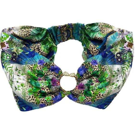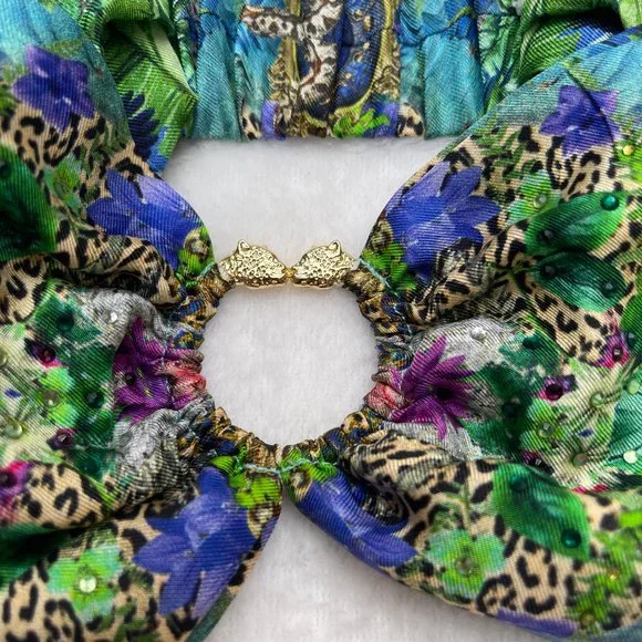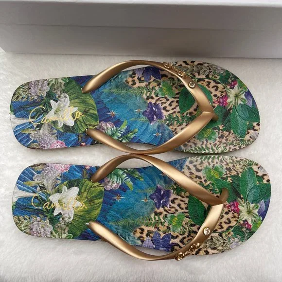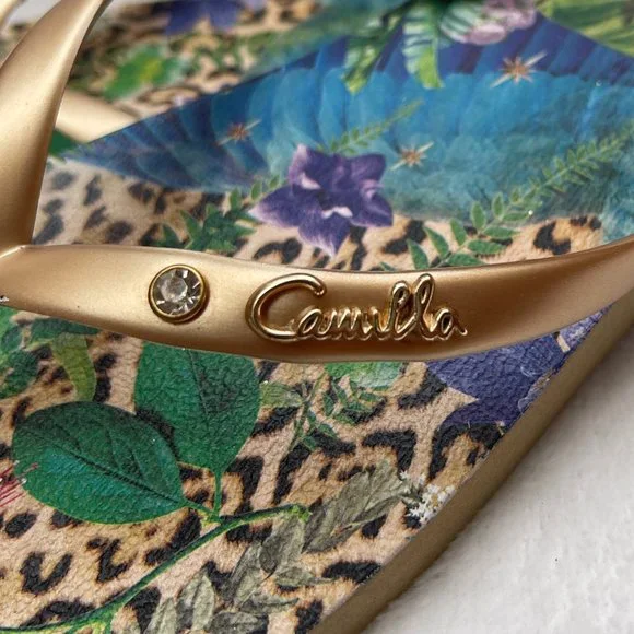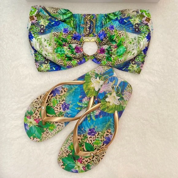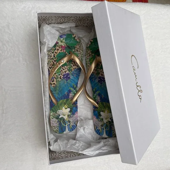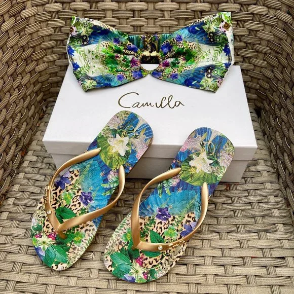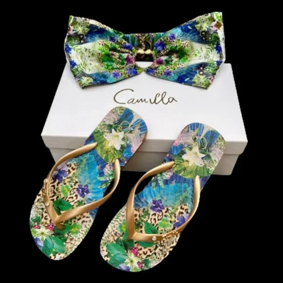 New in box giftable! The Sing My Song Ring Headband and Thongs bundle size 6/7. walks through a dark field of vibrant folkart forals. This exquisite silk headband, adorned with meticulously embellished signature CAMILLA crystals is designed for ultimate elegance. A luxurious accessory that features an elasticated backing to ensure a perfect fit. The gold hardware detailing adds a touch of sophistication, creating a soft ruching effect that accentuates the generous width of the headband.Crystals- Metal ring detail- Printed silk- Elasticated strap- W 14cm, Head circumference 56cmFabrication100% SILKThongs: size 6/7 The Sing My Song Thongs explores lush jungle green hues of unfurling foliage. Vibrant flora and sleek feline fauna guard fine strands of sparkling amulets, precious emerald jewels, and winding vines of golden sprigs. These luxury thongs are home to the CAMILLA namesake in golden hues, metallic hardware detailing, a comfortable fit and a classic strap that crosses along the foot.Lovingly handcrafted and designed in Australia, explore more from The Moral Of The Story