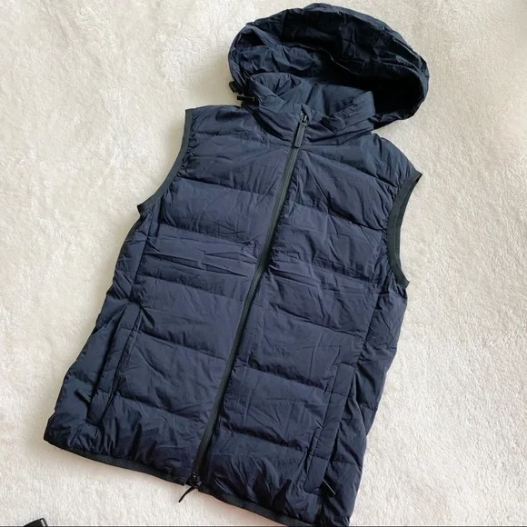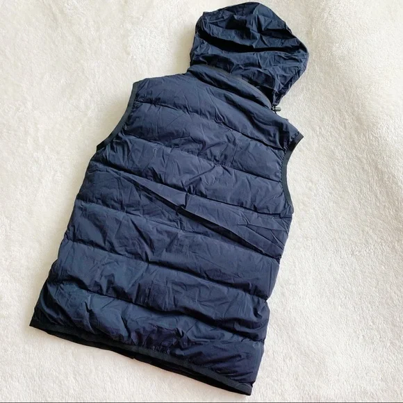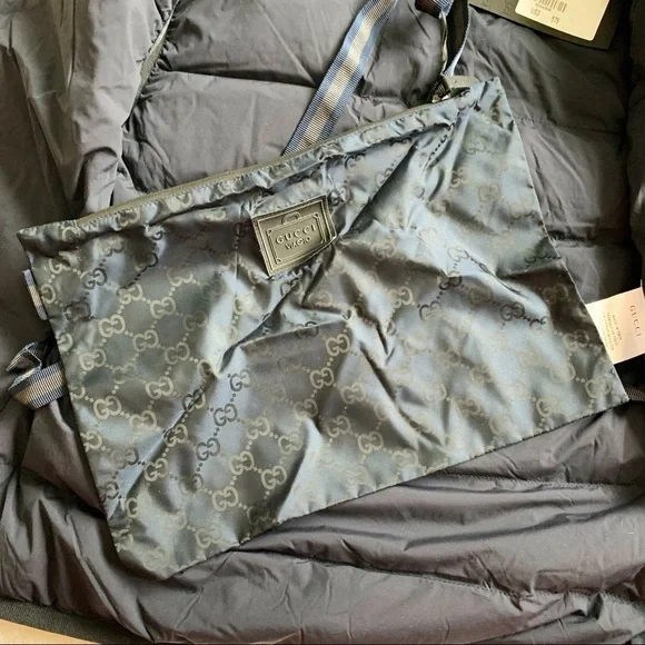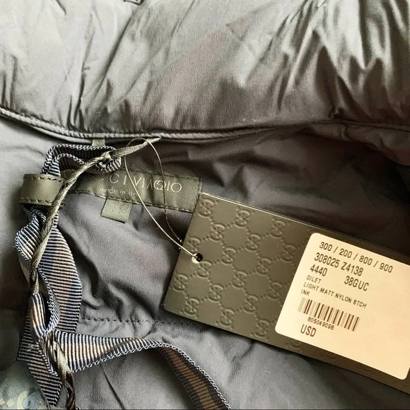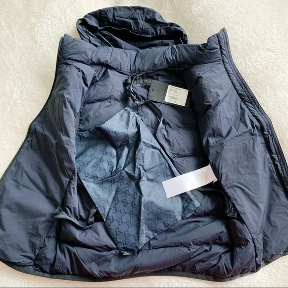 A versatile light weight packable down best from Gucci with great chic and sporty combination!Light weight water proof nylon shellTopstitching detailsPackable Expendable hood w/ zip sealCanvas trim90% ➕goose down fill, test feather fillLinedInside shoulder strap for warmth offDetachable Toiletry Zip bag