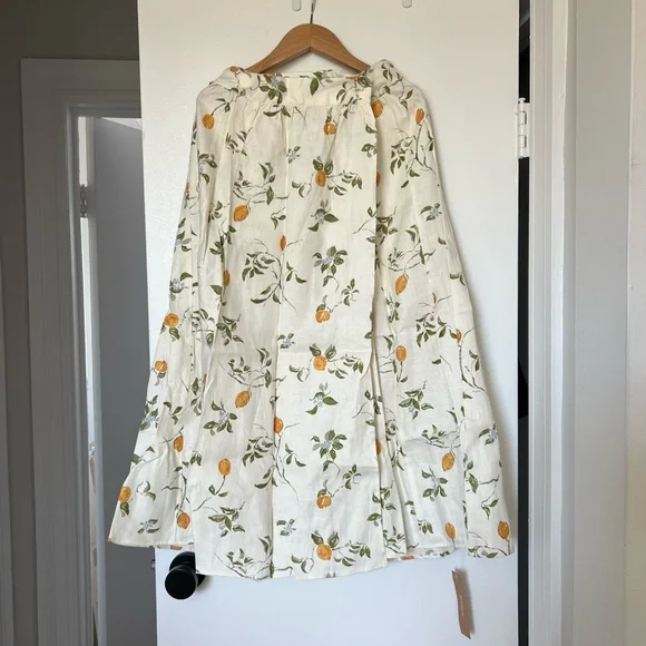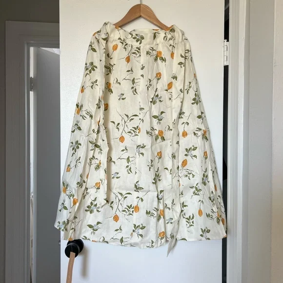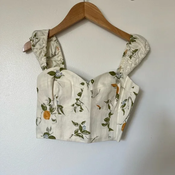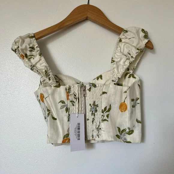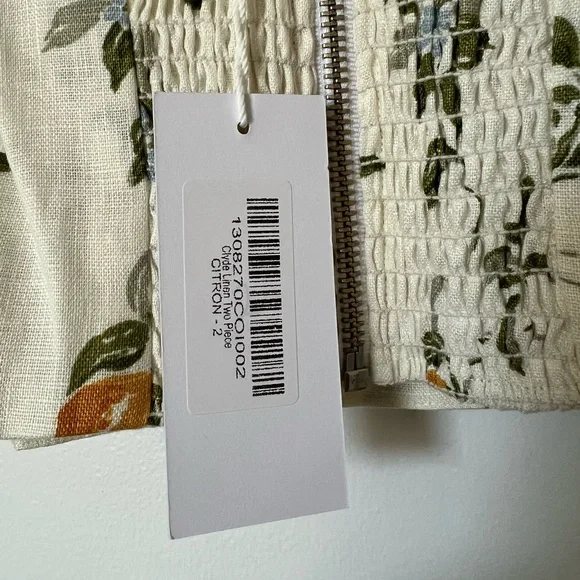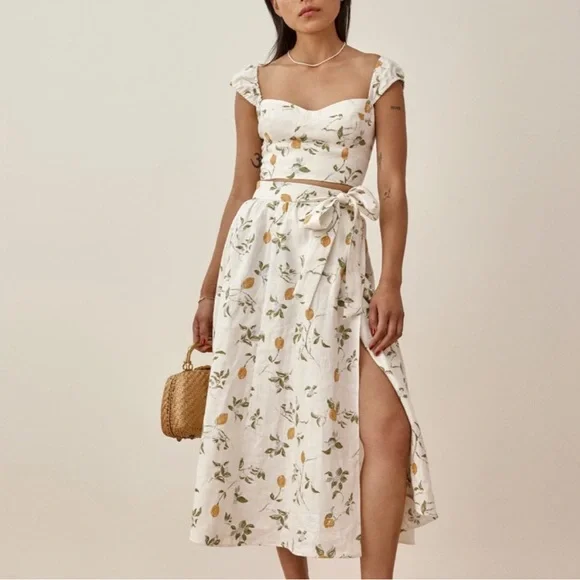 Brand new with tags. Reformation Clyde linen two-piece set. Chic cream orange citrus floral linen. Top has ruched straps, corset like zip up back. Wrap skirt with high slit. Perfect for summer outings. Absolutely adorable for weddings. Size 2.