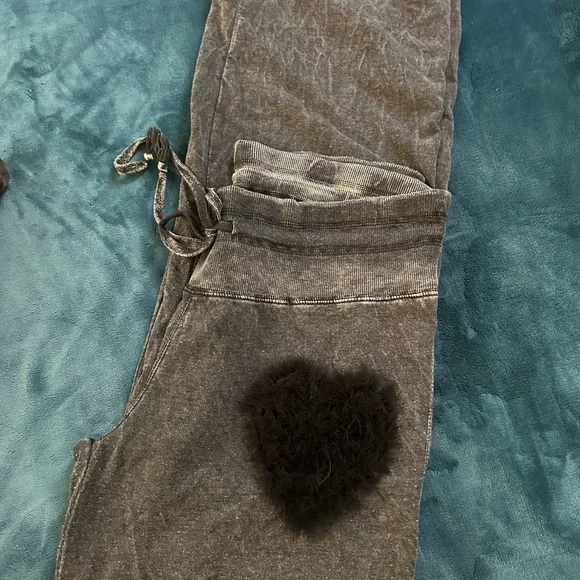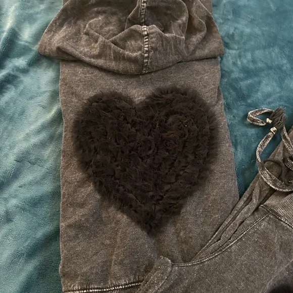 Experience ultimate comfort with T Party Fashion's mineral washed black lounge set , featuring striking black fuzzy heart accent. Set offers a relaxed fit, perfect for lounging or casual outings, combining style with a cozy feel. Super soft. Raw edge hem. Functional drawstring waist. Pit to pit measures approximately 21 inches. Sweatshirt length is approximately 24 inches. Pant inseam is approximately 33 inches. Such an amazing set. Non-smoker.